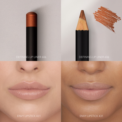 Bring soft warmth and subtle radiance to your lips with Golden Sand — the elegant match of Envy Lipstick 431 and Defining Lip Liner 606. This duo blends golden-beige tones, offering a refined nude that shines just enough.